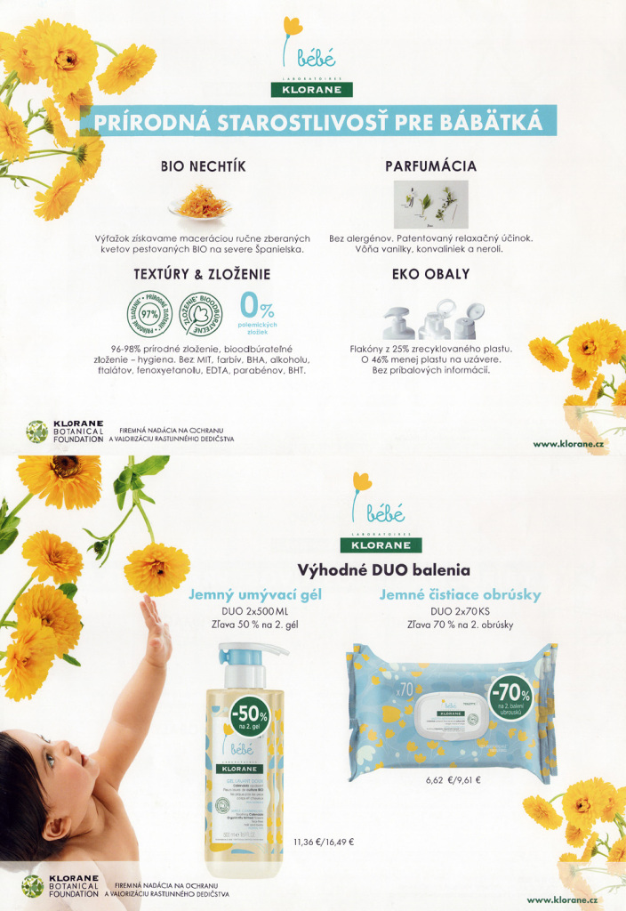 Drahé mamičky, odporúčame Vám prírodnú starostlivosť pre bábätká z dielne Klorane Bébé teraz aj vo výhodných DUO baleniach s jemným umývacím krémom a jemnými čistiacimi obrúskami za mimoriadne priaznivé ceny so zľavou -50 % na 2. gél a zľavou -70 % na 2. obrúsky!