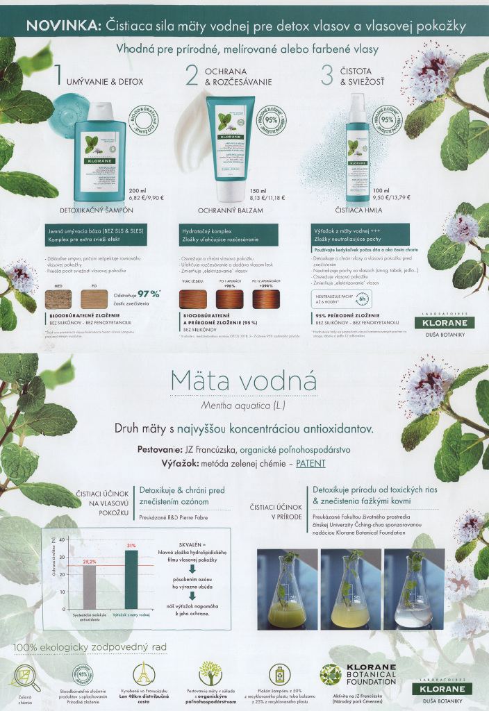 Pozrite si aj novinku z produkcie Klorane s čistiacou silu mäty vodnej pre detox vlasov a vlasovej pokožky vhodnou pre prírodné, melírované alebo farbené vlasy.